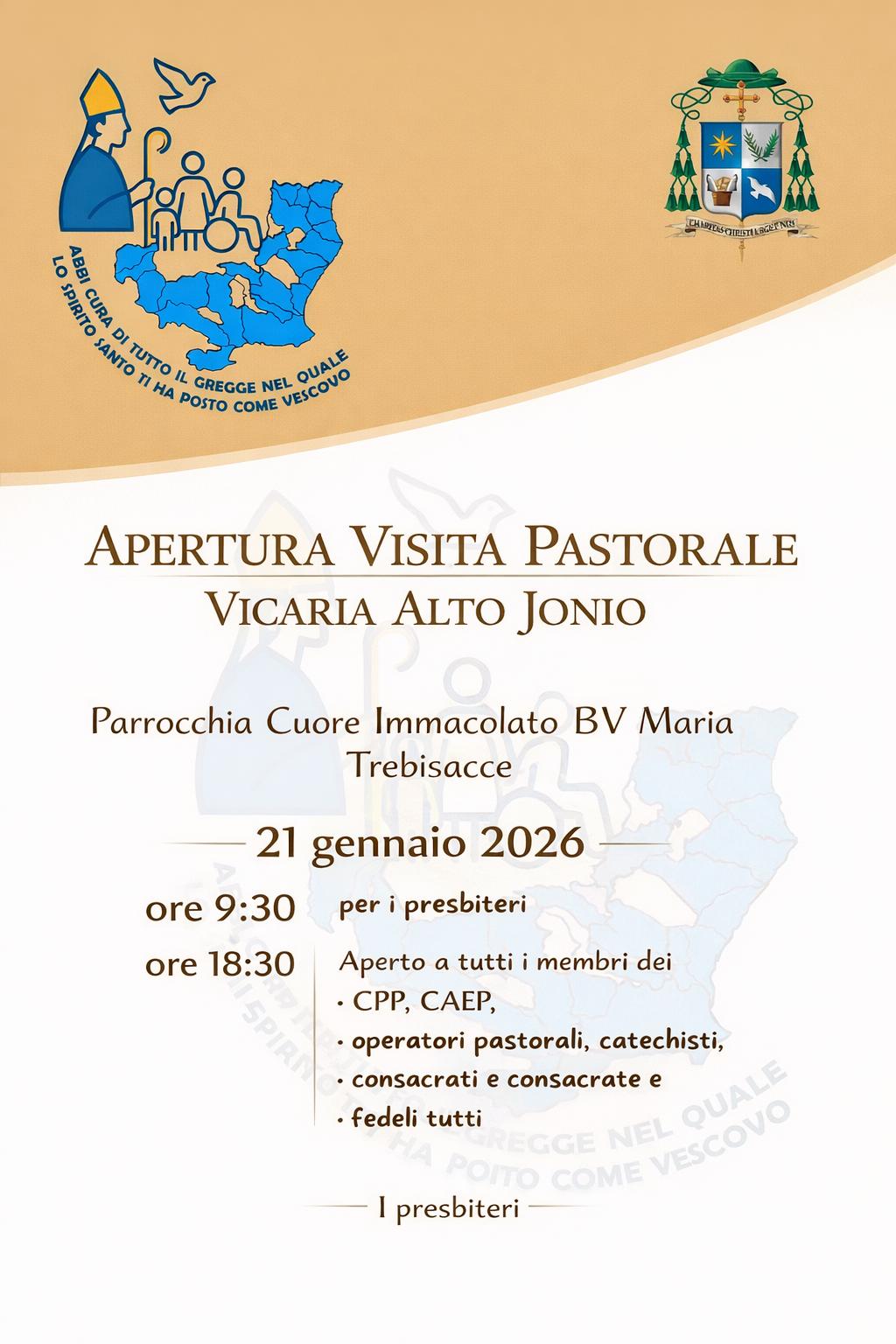 Con animo grato e spirito di profonda comunione, la nostra comunità parrocchiale si appresta a vivere l'inizio di un tempo di particolare grazia: la Visita Pastorale della Vicaria dell'Alto Jonio. In questa solenne circostanza, il nostro Pastore viene a farsi pellegrino tra le sue genti, fedele al mandato ricevuto: "Abbi cura di tutto il gregge nel quale lo Spirito Santo ti ha posto come Vescovo".