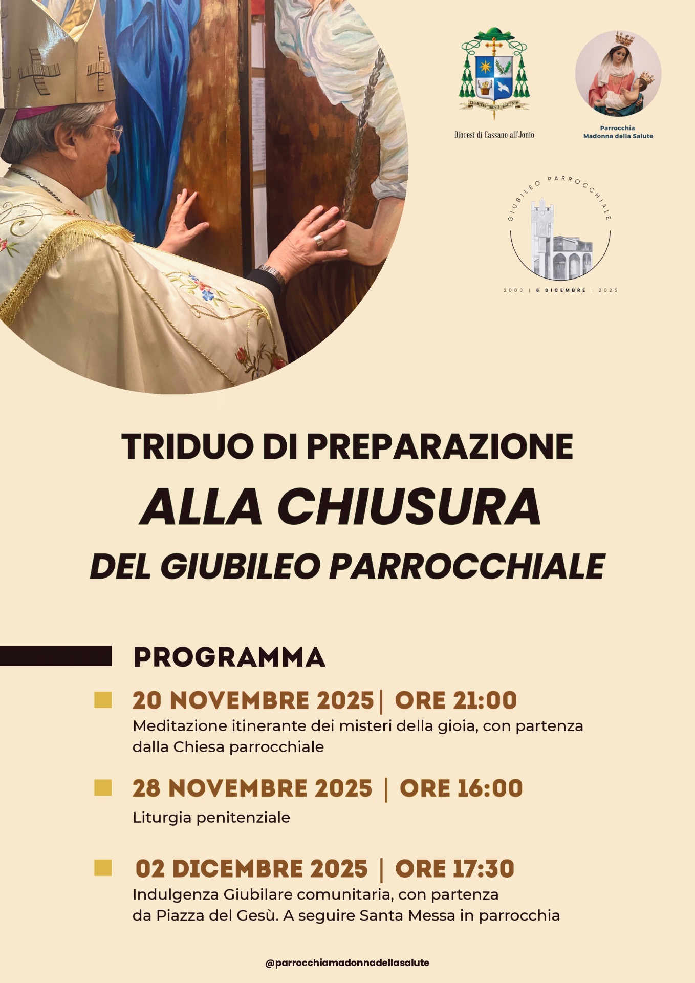 La Parrocchia Madonna della Salute di Amendolara si prepara a vivere le ultime tappe del Giubileo Parrocchiale, che raggiungerà il suo compimento domenica 7 dicembre con la Santa Messa solenne delle ore 18.00, presieduta dal Vicepresidente della CEI e Vescovo di Cassano all'Jonio, S.E. Rev.ma Mons. Francesco Savino. Un appuntamento atteso, che rappresenta il culmine di un anno di grazia, preghiera e rinnovamento spirituale per l'intera comunità.