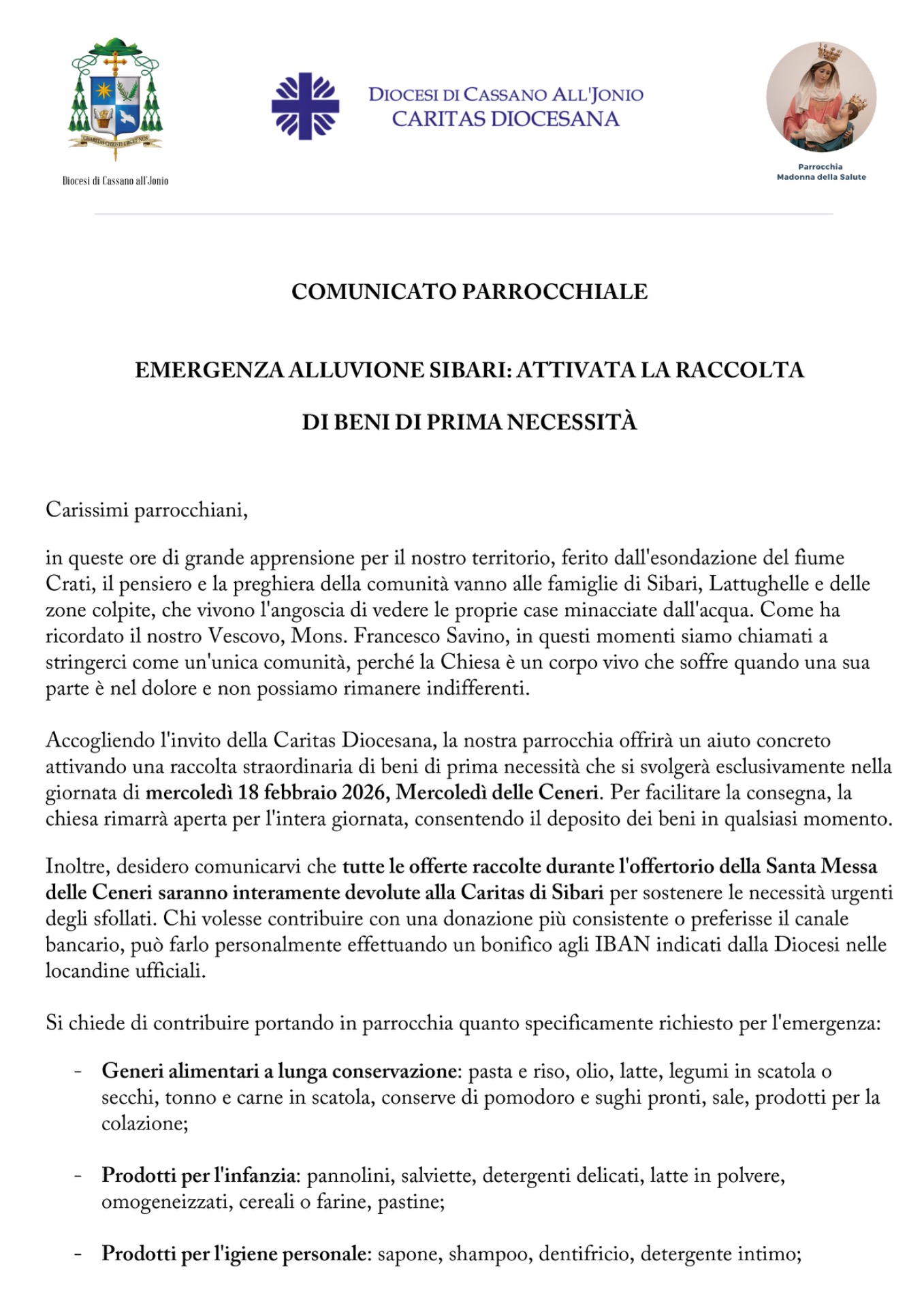 Inoltre, desidero comunicarvi che tutte le offerte raccolte durante l'offertorio della Santa Messa delle Ceneri saranno interamente devolute alla Caritas di Sibari per sostenere le necessità urgenti degli sfollati. Chi volesse contribuire con una donazione più consistente o preferisse il canale bancario, può farlo personalmente effettuando un bonifico agli IBAN indicati dalla Diocesi nelle locandine ufficiali.
