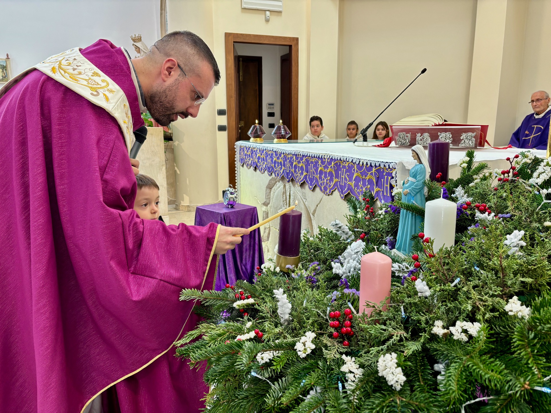 Il parroco ha iniziato il rito con l'accensione della prima candela della corona d'Avvento, affidando ai più piccoli il compito di accompagnare con la preghiera questo segno. «Accendiamo, Signore, questa luce, segno della nostra speranza», ha pregato, ricordando che ogni candela rappresenta una tappa del percorso che la comunità è chiamata a vivere insieme.