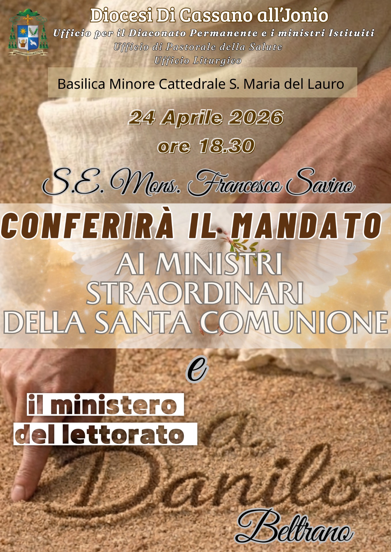 Nel pomeriggio di venerdì 24 aprile, alle 18.30, presso la Basilica Cattedrale di Santa Maria del Lauro a Cassano, il vescovo Francesco Savino presiederà la Santa Messa per il conferimento e il rinnovo del mandato ai ministri straordinari dell'Eucaristia (durante la stessa celebrazione verrà conferito anche il ministero del lettorato a Danilo Beltrano, candidato al diaconato permanente).
