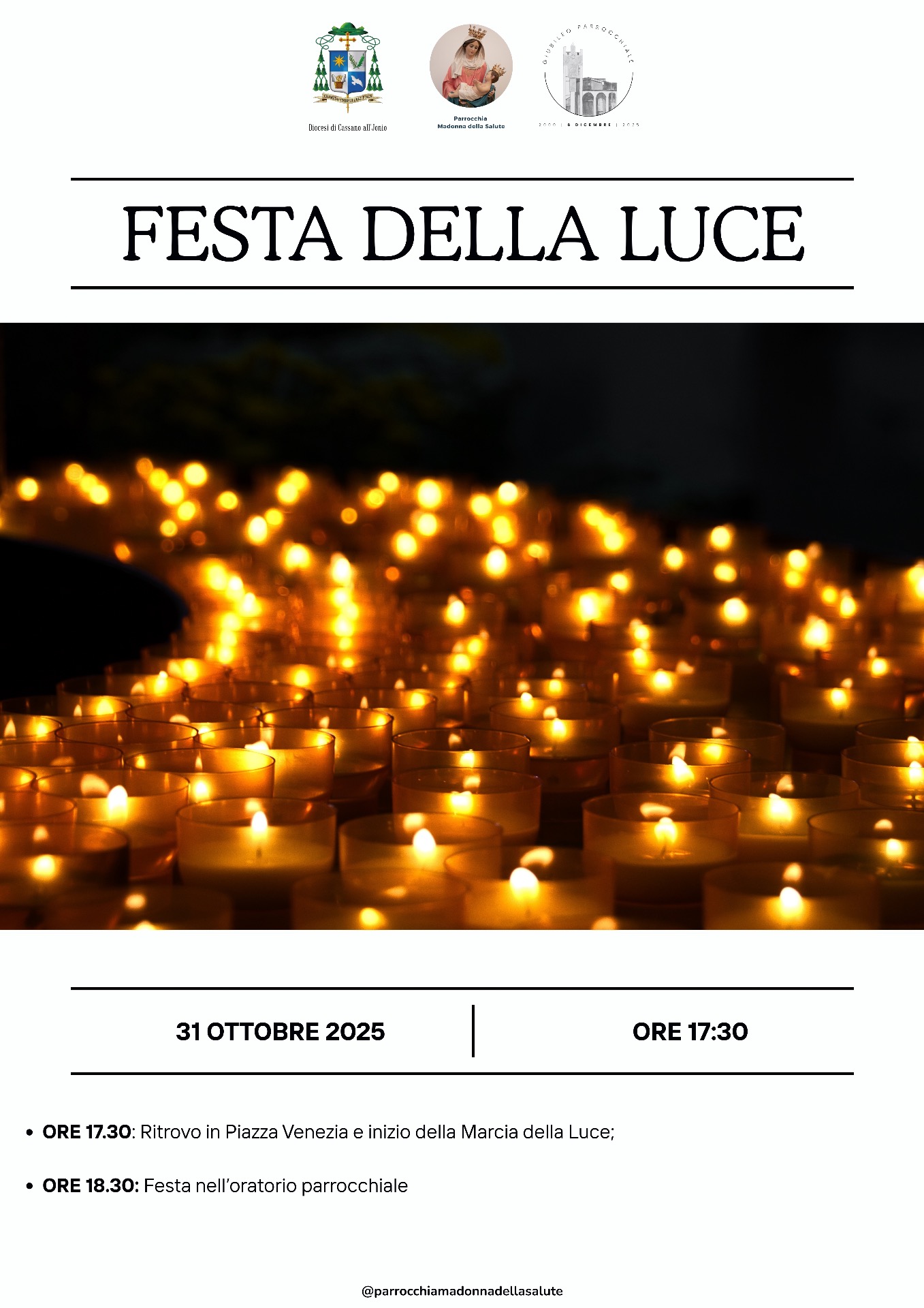 Venerdì 31 ottobre, la Parrocchia Madonna della Salute di Amendolara vivrà un intenso momento di fede e di gioia comunitaria con la Festa della Luce, un appuntamento che ogni anno coinvolge e unisce l'intera comunità.In vista della Solennità di Tutti i Santi, questa festa vuole richiamare l'identità profonda di ogni battezzato: figli di Dio, quindi...